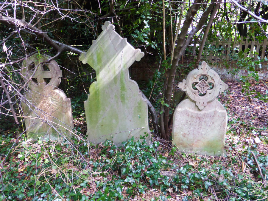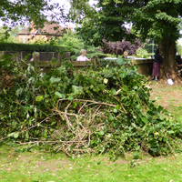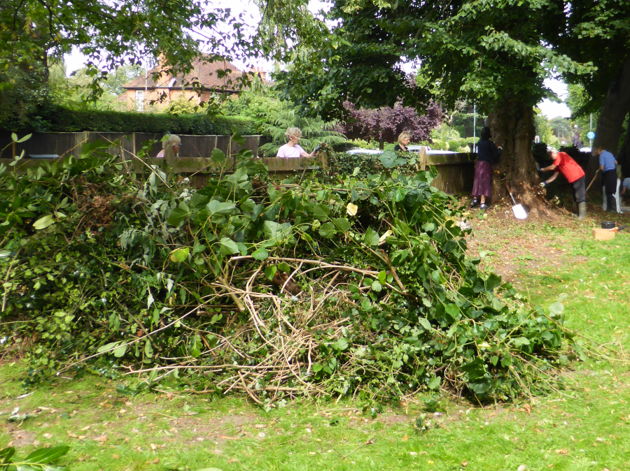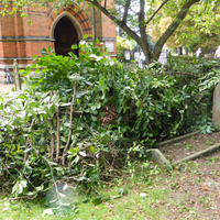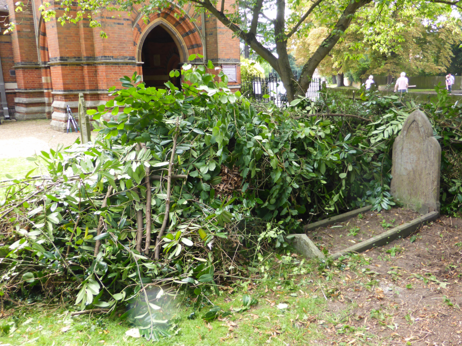 In answer to some queries the maintenance of the Graveyard is the responsibility of the RBWM - however they have limited resources to deal with areas of self-seeded poor quality shrubs and ivy covering, and preventing access to, historic graves. As the RBWM could not access this area due to this over-growth - the team worked with the Borough Cemeteries Officer who arranged for the disposal of the removed shrubs/ivy/low branches preventing this access. There will probably need to be a third working party to complete the planned work and hopefully the RBWM will then be able to maintain the area. The work has not impinged upon the area designated by the RBWM to be left alone for wildlife (in fact this area, having been left to it's own devices, is larger than intended by the Council, and does cover some graves). The tree canopy remains for birds and insects. The access and exposure of historic graves has been welcomed by individuals and local societies and our thanks go to the Borough Cemeteries Officer and the working parties members for making this much needed improvement to the historic graveyard.