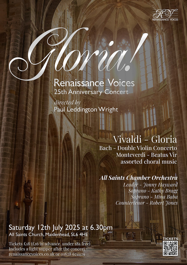 Once again we welcomed Renaissance Voices to All Saints on Saturday 12 July at 6:30pm for their 25th Anniversary Concert performing Gloria, Directed by Paul Leddington Wright, (former Director of music for the BBC programme "Songs of Praise" and Director of Music at Coventry Cathedral).
